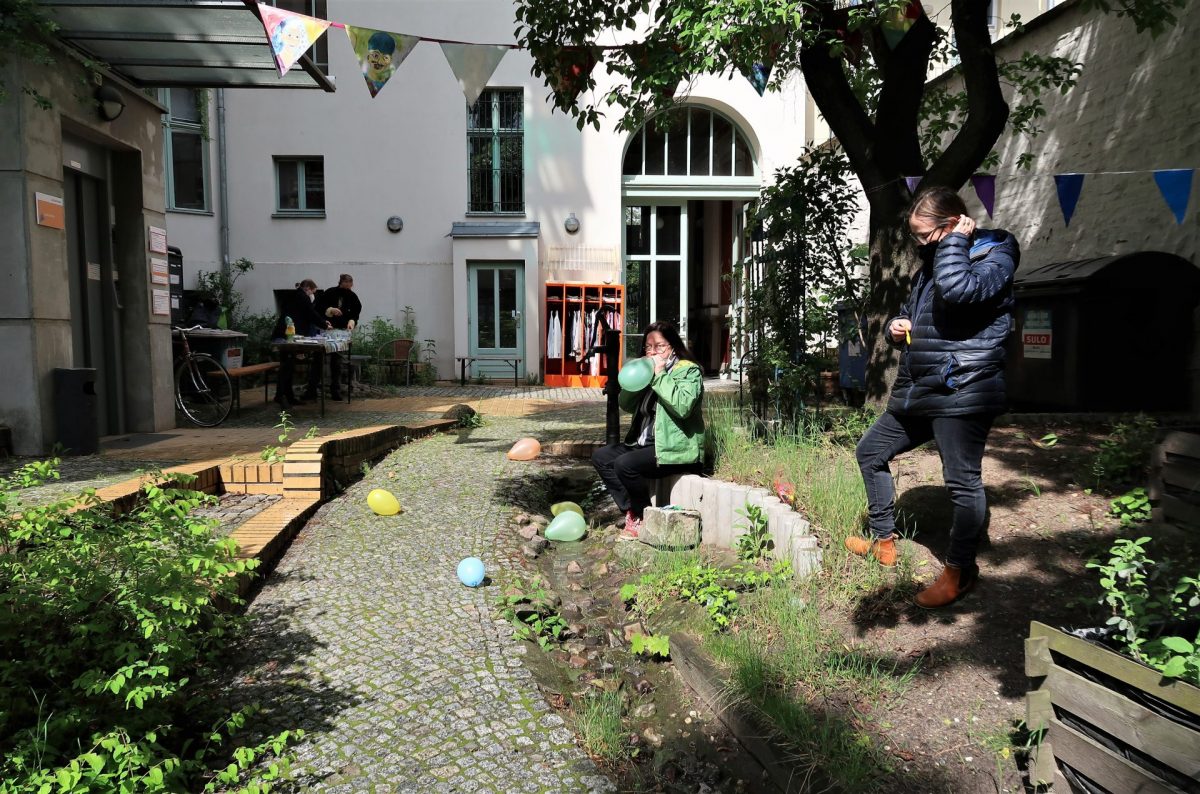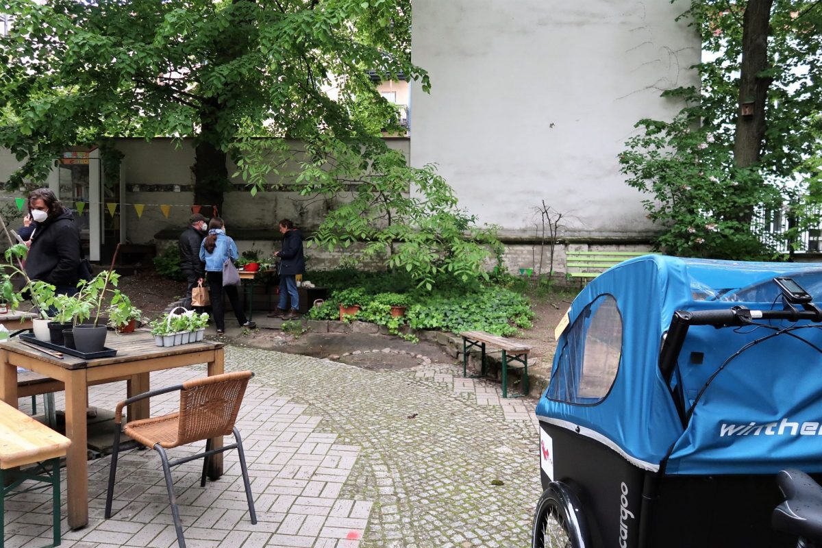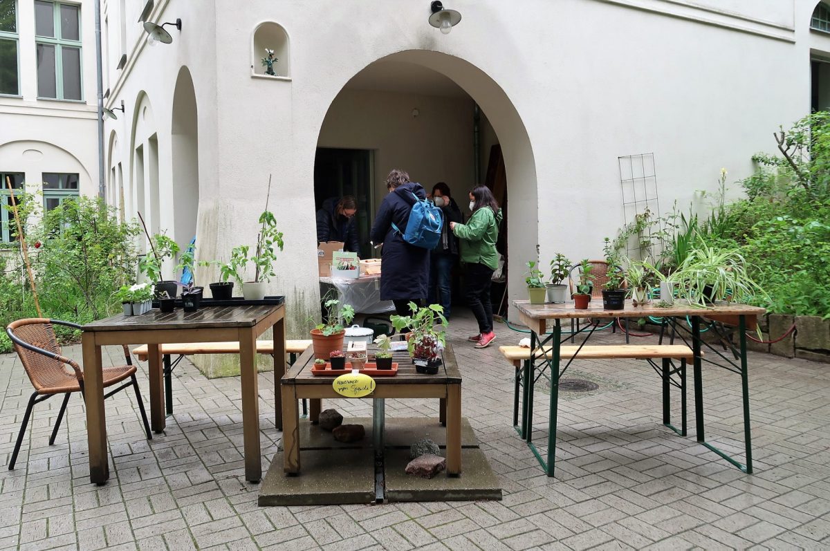 Zum Fest der Nachbar*innen, am 28. Mai 2021 zwischen 15 und 18 Uhr, veranstalteten wir unsere erste Pflanzen und Saatgutbörse. Es war gleichzeitig das erste öffentliche Event seit über einem Jahr der Corona-Beschränkungen, das im Hof des Stadtteilzentrums stattfand, natürlich unter Einhaltung der Hygieneregeln. Wir waren gespannt, denn das Wetter war genauso launisch wie in den letzten Wochen, eine Mischung aus Regen und Sonne. Trotz einiger kleiner Regenschauer kamen zahlreiche Interessent*innen, um Pflanzen und Saatgüter zu tauschen. Viele Besucher*innen kamen miteinander ins Gespräch.
