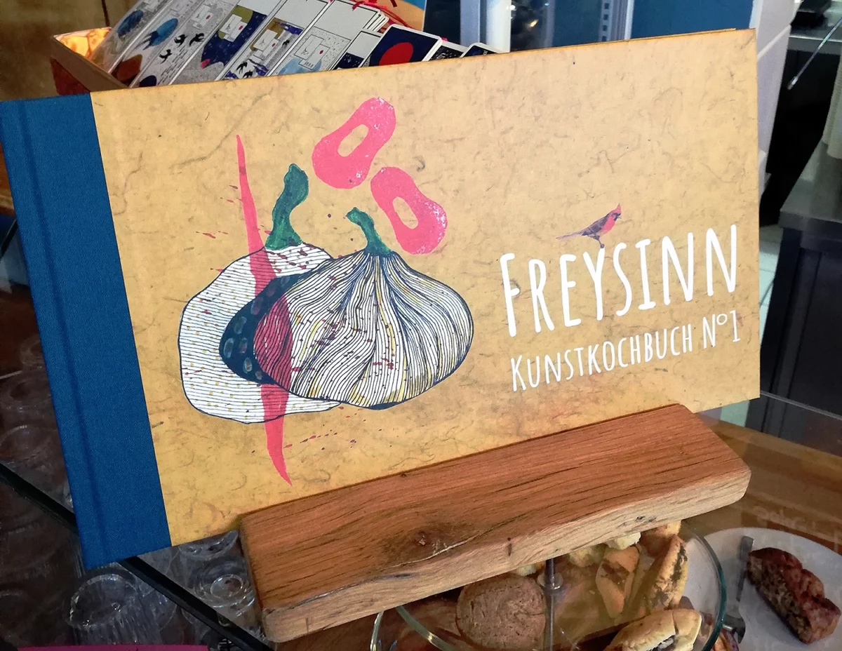 Das das von Hand illustrierte Kunstkochbuch, welches während der Ausstellung zur Ansicht in der Galerie ausliegt, kann bei Interesse erworben werden. Schicken Sie dafür eine Mail an info@freysinn.com.