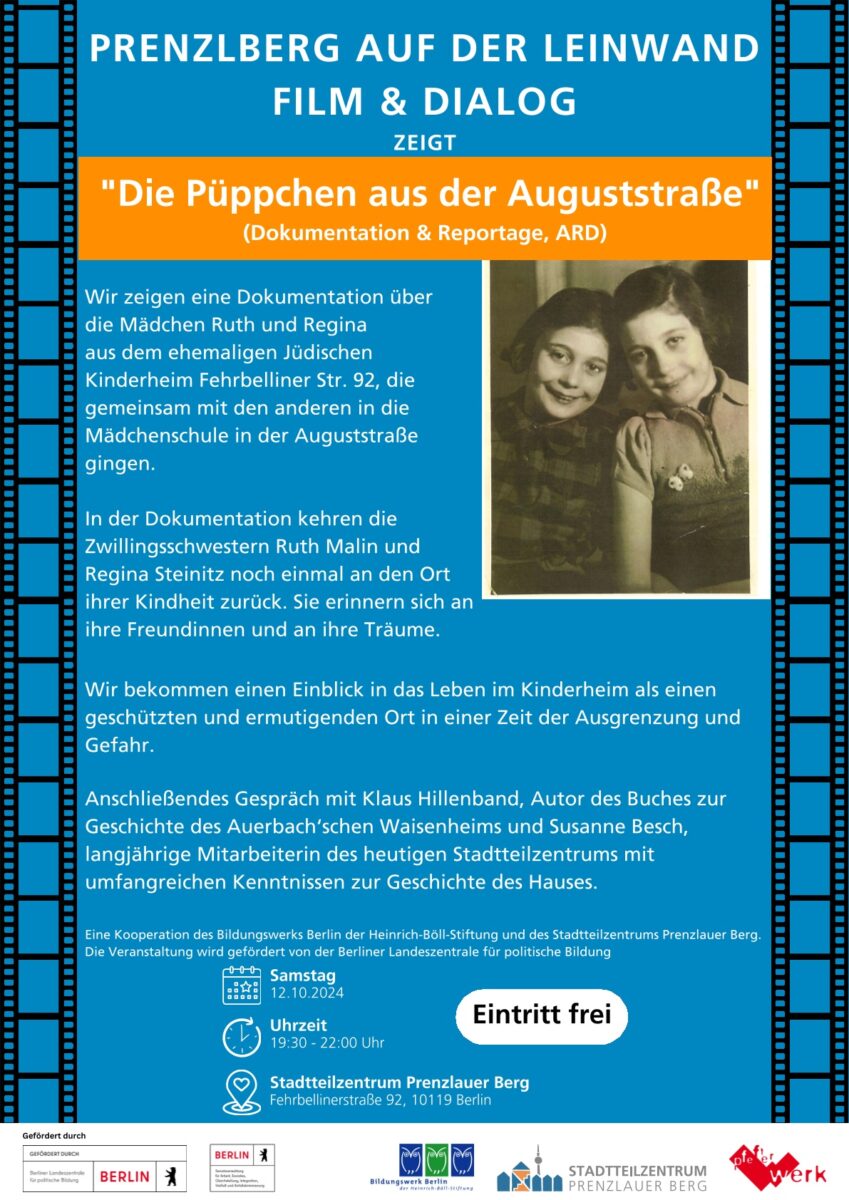 Wir zeigen eine Dokumentation über die Mädchen Ruth und Regina aus dem ehemaligen Jüdischen Kinderheim Fehrbelliner Str. 92, die gemeinsam mit den anderen in die Mädchenschule in der Auguststraße gingen. In der Dokumentation kehren die Zwillingsschwestern Ruth Malin und Regina Steinitz noch einmal an den Ort ihrer Kindheit zurück.