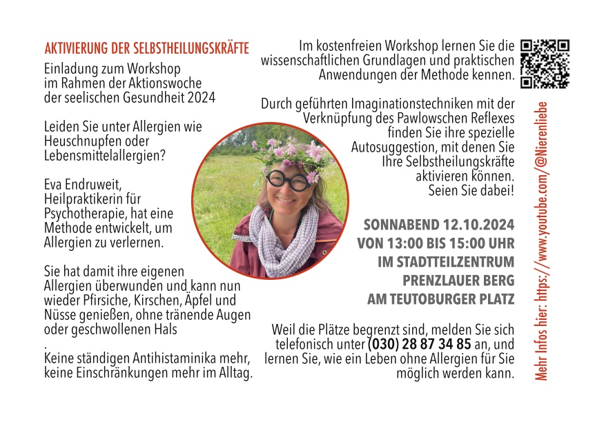 Im Rahmen der "Woche der seelischen Gesundheit" laden wir am 12. Oktober 2024 zu dem Workshop "Allergie verlernen. Wie soll das gehen?" von Eva Endruweit, Heilpraktikerin für Psychotherapie, ein.