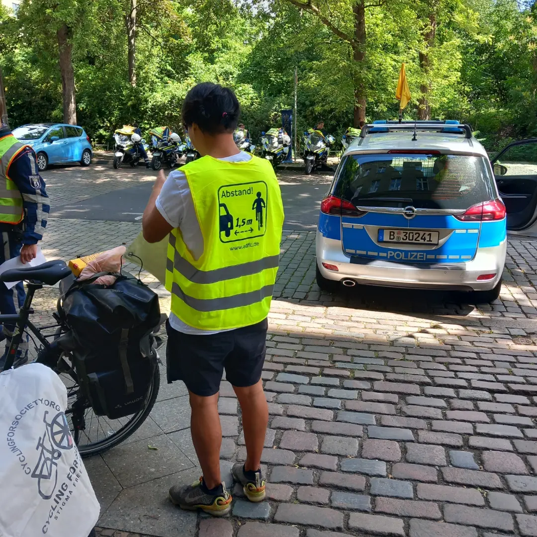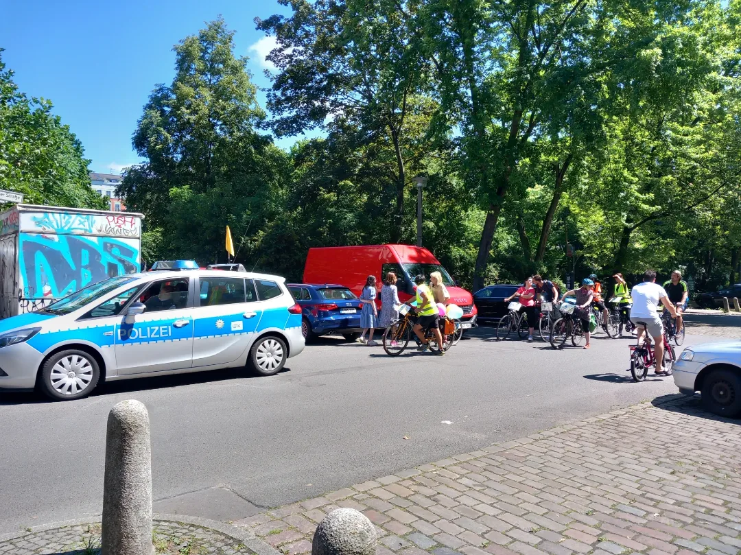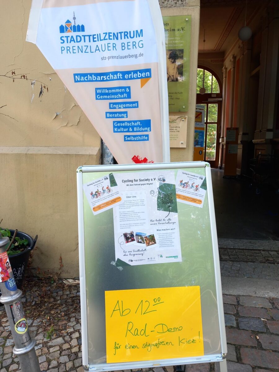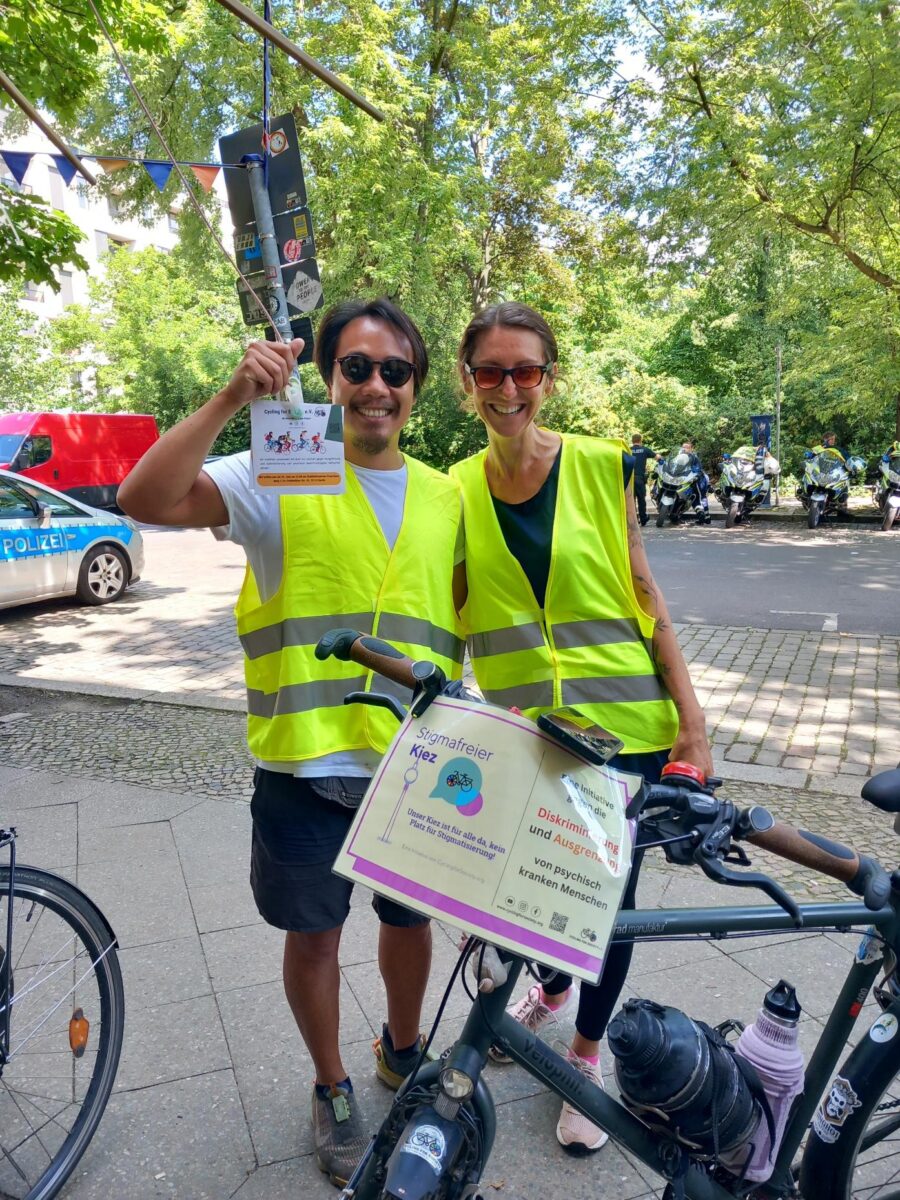 Hieß es bei uns am 24. Juni. Der Verein Cycling for Society e.V. setzt sich gegen die Ausgrenzung und Diskriminierung psychisch kranker Menschen ein, möchte Vorurteile überwinden, aufmerksam machen und aufklären. Iris und Jan waren bereits bei uns im Stadtteilzentrum um ihren mobilen Infostand im April zu bauen. Im Mai waren sie damit auf unserem Nachbarschaftsfest vertreten. Am Samstag den 24. Juni ging es dann auf dem Fahrrad 15 Kilometer durch Pankow: Die 7-köpfige Gruppe wurde von ebenso vielen Polizei-Motorrädern eskortiert, was sich im ersten Moment wirklich etwas verrückt anfühlte, aber bestimmt auch für die nötige Aufmerksamkeit gesorgt hat.