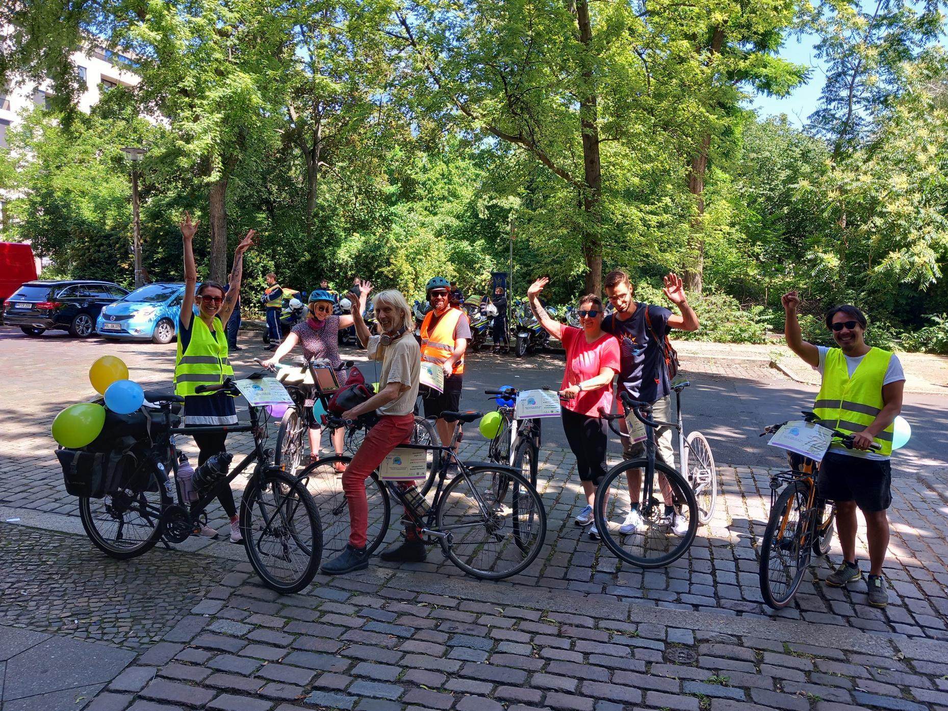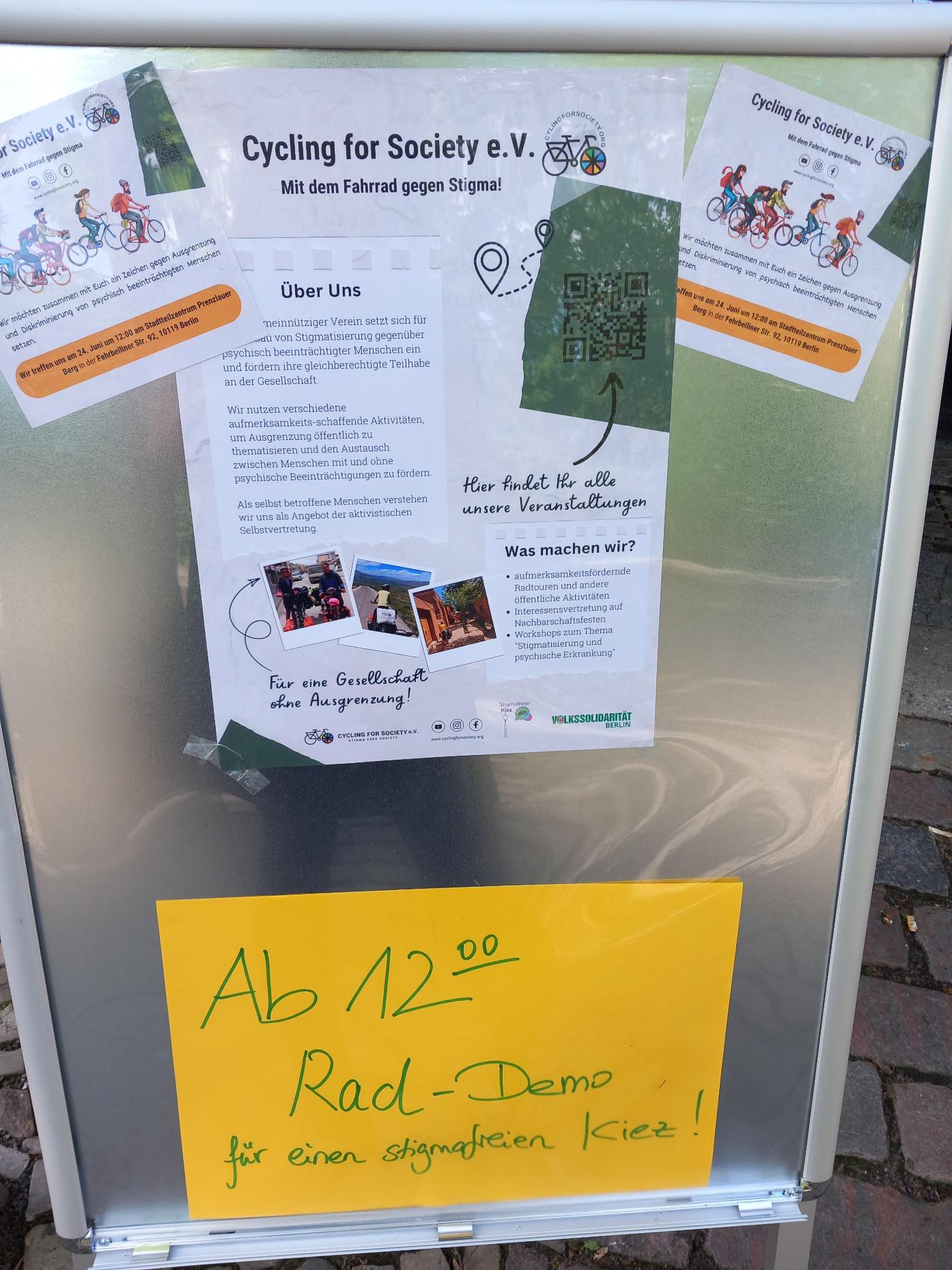 Hieß es bei uns am 24. Juni. Der Verein Cycling for Society e.V. setzt sich gegen die Ausgrenzung und Diskriminierung psychisch kranker Menschen ein, möchte Vorurteile überwinden, aufmerksam machen und aufklären. Iris und Jan waren bereits bei uns im Stadtteilzentrum um ihren mobilen Infostand im April zu bauen. Im Mai waren sie damit auf unserem Nachbarschaftsfest vertreten. Am Samstag den 24. Juni ging es dann auf dem Fahrrad 15 Kilometer durch Pankow: Die 7-köpfige Gruppe wurde von ebenso vielen Polizei-Motorrädern eskortiert, was sich im ersten Moment wirklich etwas verrückt anfühlte, aber bestimmt auch für die nötige Aufmerksamkeit gesorgt hat.
