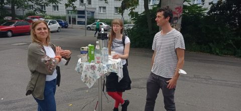 Bei Sonnenschein fand wie jeden Dienstag zwischen 12:00 und 13:30 Uhr das Bordsteincafé mit Kuno und Ramona statt. Zugegeben, der Kaffee war heute etwas dünn, aber dafür waren die Gespräche umso besser. Es wurden wieder Wünsche für den Kiez gesammelt: die Themen, die die Nachbarn im Viertel bewegen, sind die Grünanlagen, Bänke und die Schaffung von Begegnungsmöglichkeiten für die Nachbarschaft.