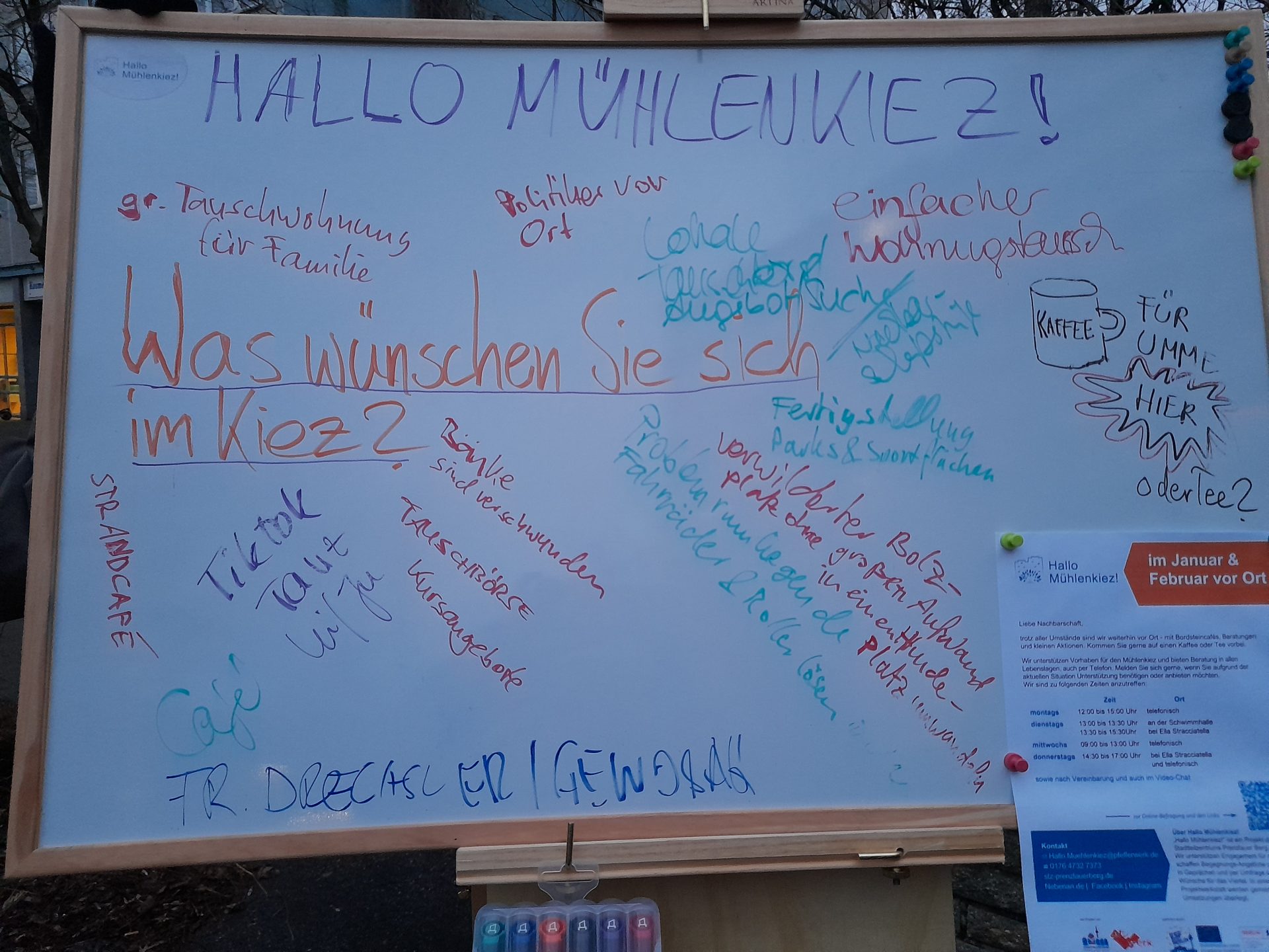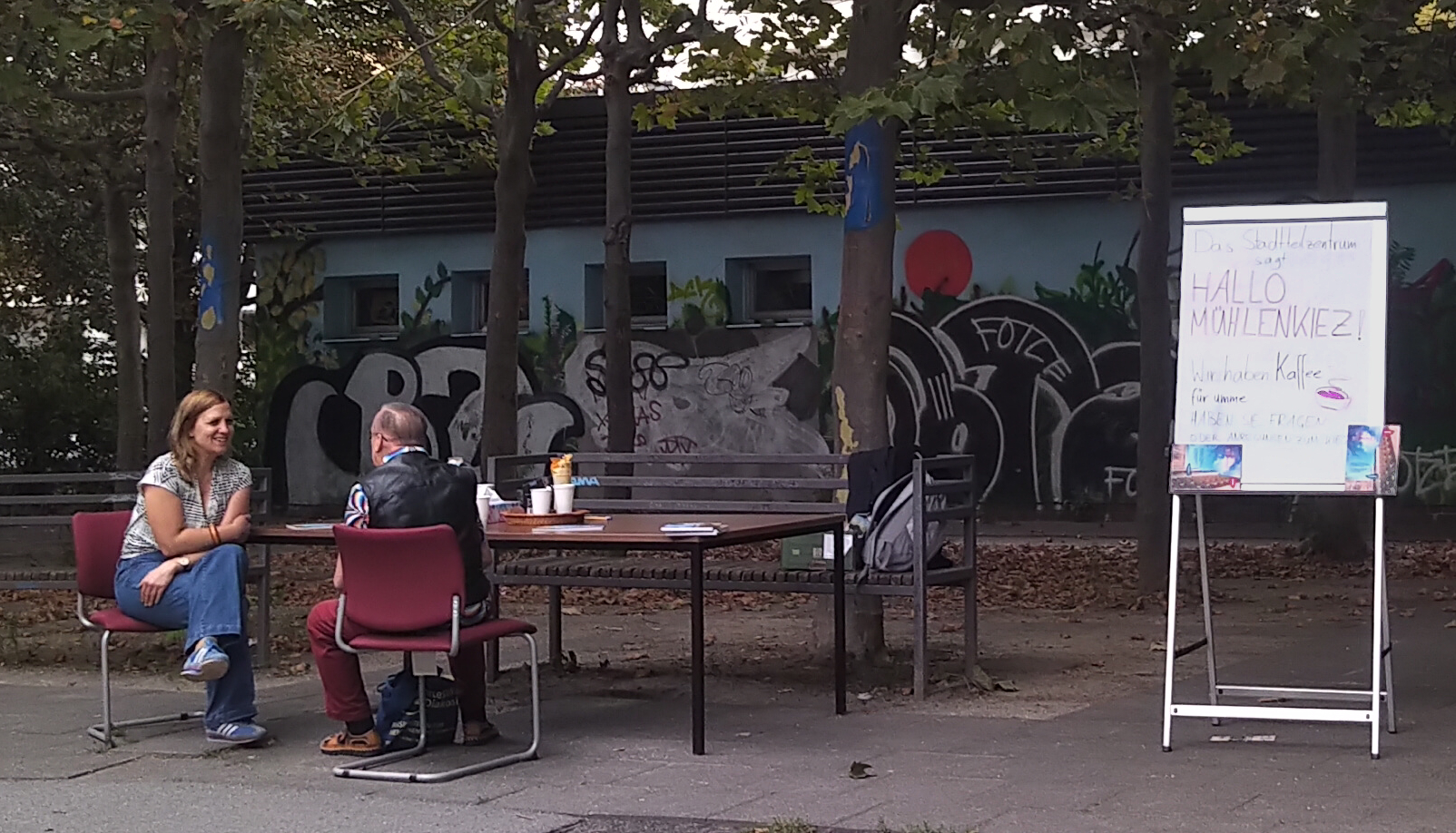 Bei unserem wöchentlichen Bordsteincafé waren die vorherrschenden Themen der Menschen die ökologische Gestaltung des Mühlenkiezes und der Wunsch nach Nachbarschaftstreffpunkten sowie unterstützten Freizeitangeboten. Es wurde der Wunsch nach Computer- und Fotografiekursen geäußert, ebenso wie das Wiederaufleben der Reparaturwerkstatt in der Kulturmarkthalle. Auch wünschten sich Anwohnende ein Nachbarschaftscafé, wo man Getränke zum Selbstkostenpreis kaufen und sich mit Nachbarn treffen kann. Was für tolle Ideen! Wenn Sie Ihre Idee gemeinsam mit anderen umsetzen möchten, melden Sie sich gerne telefonisch, per Email oder im Rahmen des Bordsteincafés beim Projektteam. Wir freuen uns.