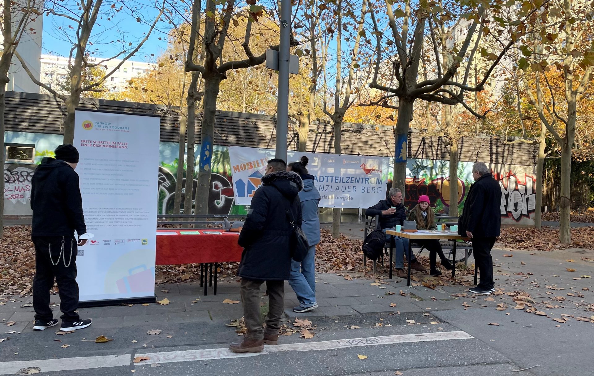Am 29. Oktober 2021 in der Zeit zwischen 14.00 und 16.00 Uhr präsentierte „Hallo Mühlenkiez!“ in Kooperation mit dem Pankower Bündnis für Zivilcourage sowie dem Mobilen Stadtteilzentrum im Mühlenkiez den Koffer für Zivilcourage vor dem Quartierspavillon in der Thomas-Mann-Straße.