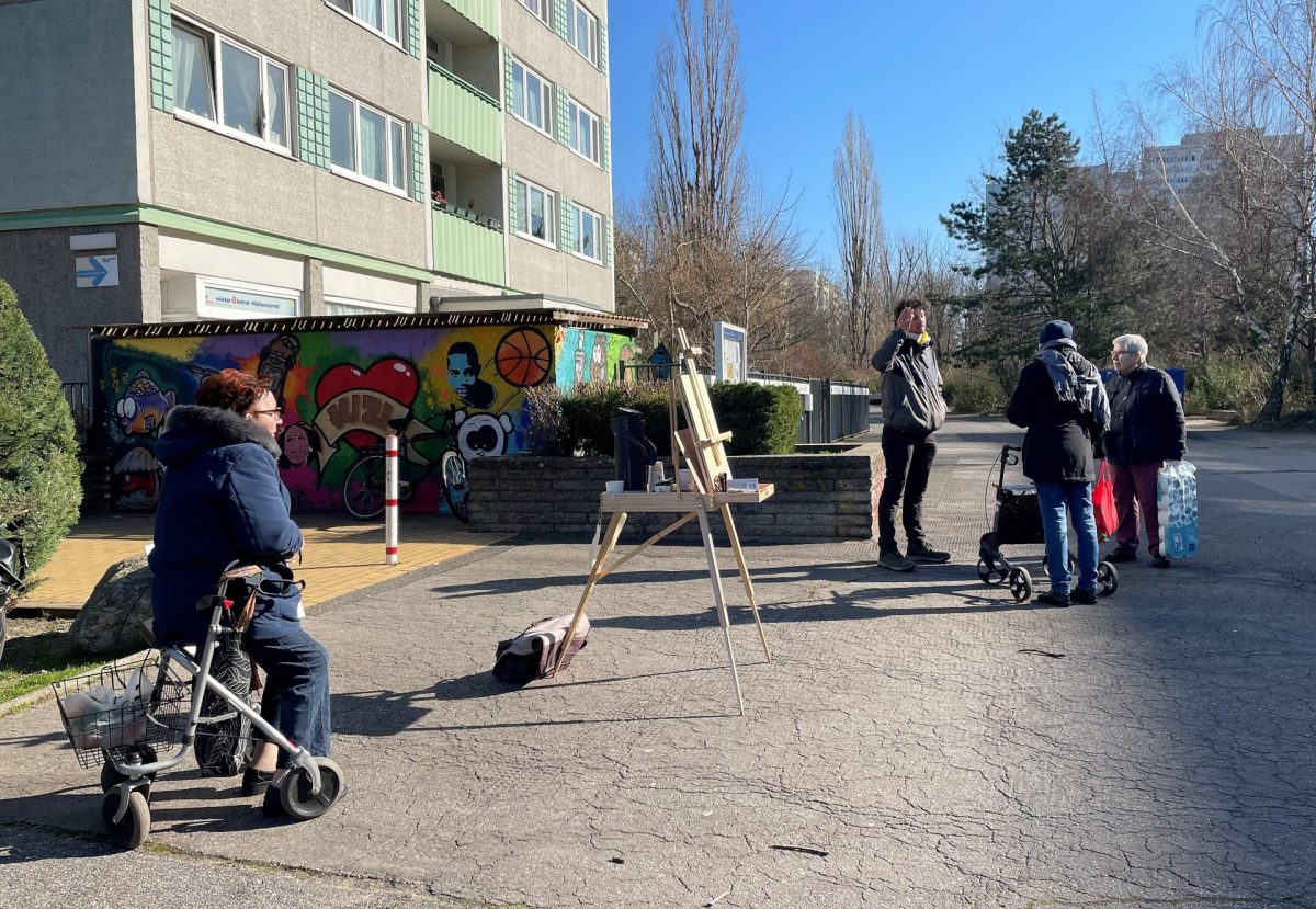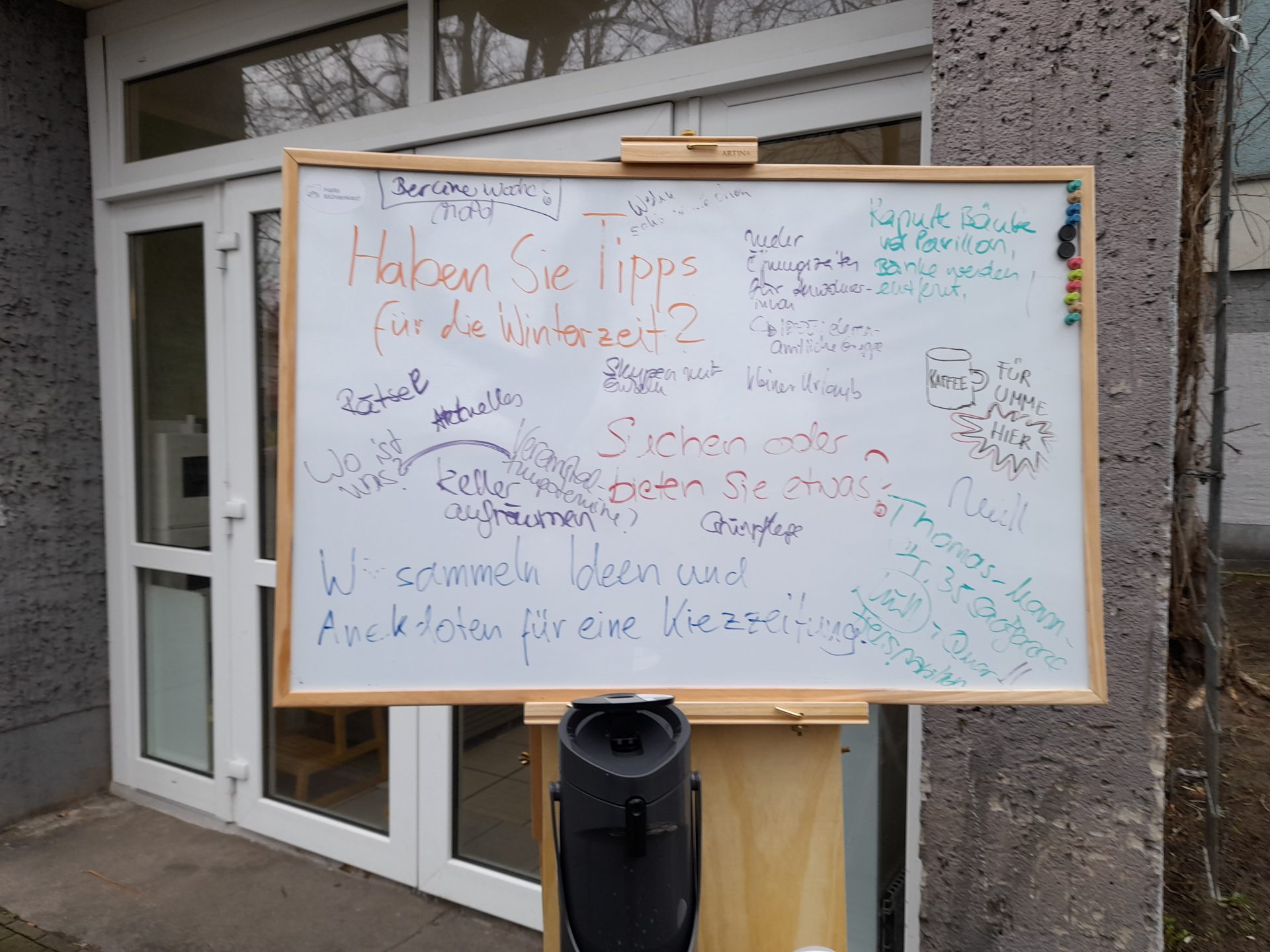 Am 29. März war das Team von "Hallo Mühlenkiez!" wieder von 12:00 bis 13:30 Uhr vor der Schwimmhalle im Kiez vertreten. Obwohl wir unsere Staffelei, auf der wir Wünsche für den Kiez sammelten, anfangs ganz schön festhalten mussten angesichts des auffrischenden Windes, versammelte sich doch ein Trüppchen Nachbar*innen auf einen Kaffee zum Gespräch. Erstmalig konnte das Extrablatt ausgegeben werden und sogar das Bezirksamt kam auf einen Tee vorbei. Das Thema Kiezverschmutzung kam auf und eine Putzaktion wurde von Nachbar*innen vorgeschlagen. Auch über den Bedarf an einem IT-Kurs für Senior*innen vor Ort im Kiez wurde diskutiert. Am Ende kam sogar noch die Sonne raus.