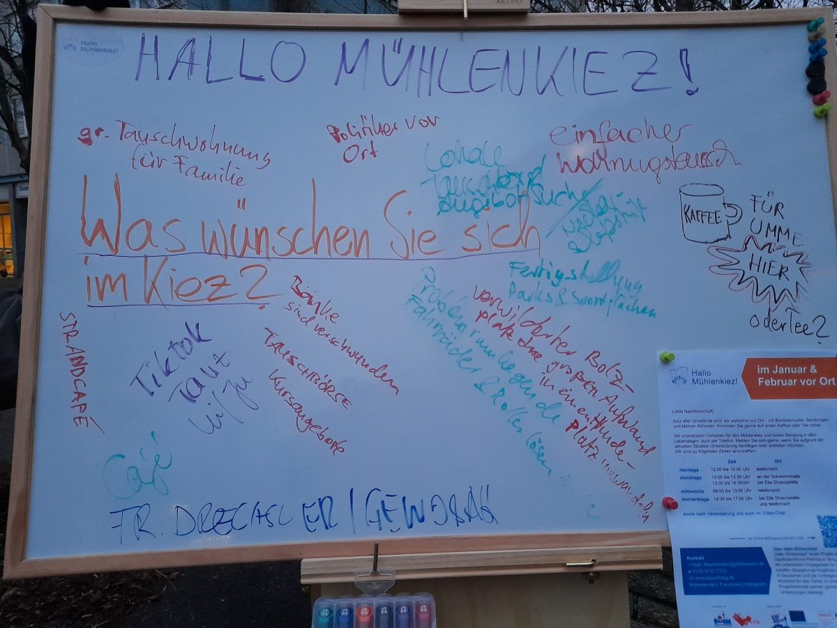 Am Sonntag war es endlich soweit: auf der Nachbarschaftsversammlung am 15. Mai im Quartierspavillon wurden die Ergebnisse der aktivierenden Befragung vorgestellt, die im Mühlenkiez durchgeführt wurde.