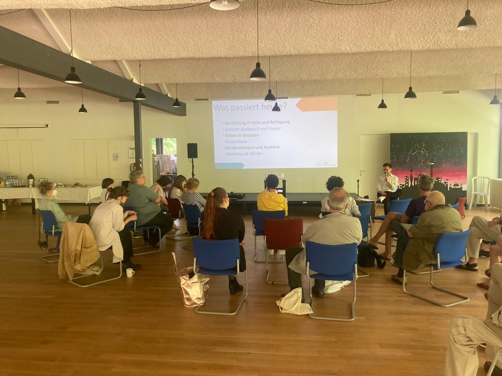 Nach der Vorstellung der Ergebnisse sowie dem Ausblick auf die Aufgaben des Teams von "Hallo Mühlenkiez!" bis zum Projektende konnten die Teilnehmer*innen während einer kleinen Pause Kontakte zu Nachbar*innen auffrischen oder neue Kontakte knüpfen und auf diese Weise gemeinsame Interessen entdecken.