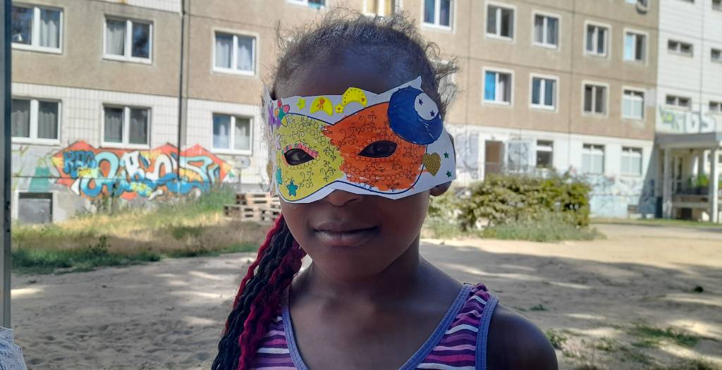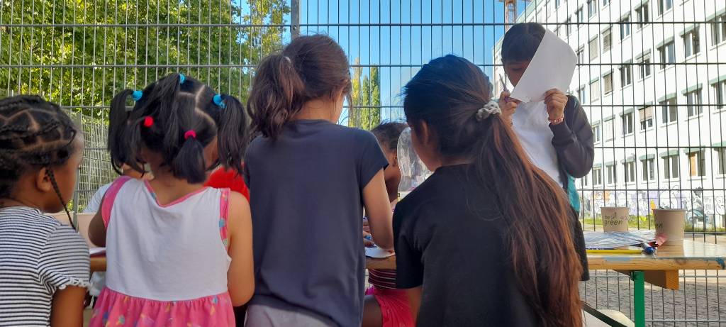 Nach dem Bordsteincafé an der Schwimmhalle haben wir den Standort gewechselt und unser Bordsteincafé im Hof der Unterkünfte für wohnungslose Menschen in der Storkower Straße aufgebaut. Hier kamen wir über Malen und Apfelschorle schnell mit dem Kinderbetreuer der Unterkunft und den Kindern, die in der Unterkunft mit ihren Eltern wohnen, ins Gespräch. Bei strahlendem Sonnenschein wurde viel gelacht, gemalt (ein ganzes Notizbuch ist für uns ausgefüllt worden mit wunderbaren Zeichnungen) und über die Interessen der Kinder gesprochen.
