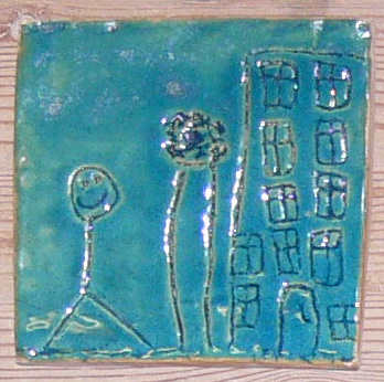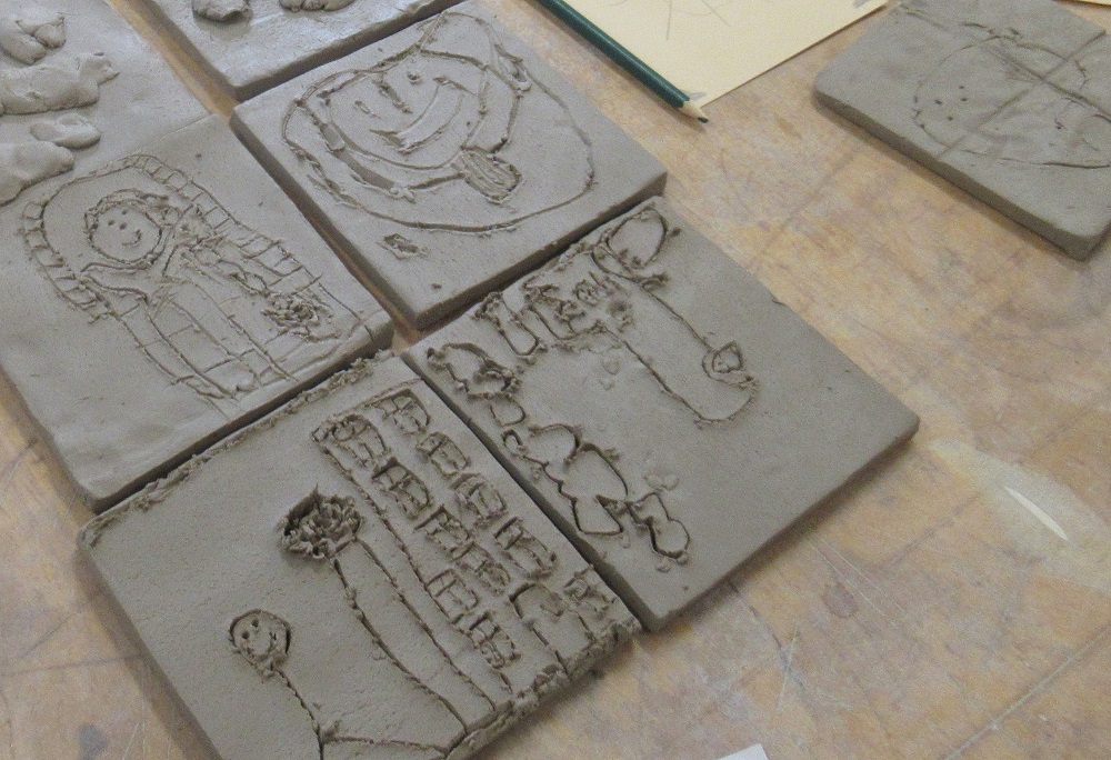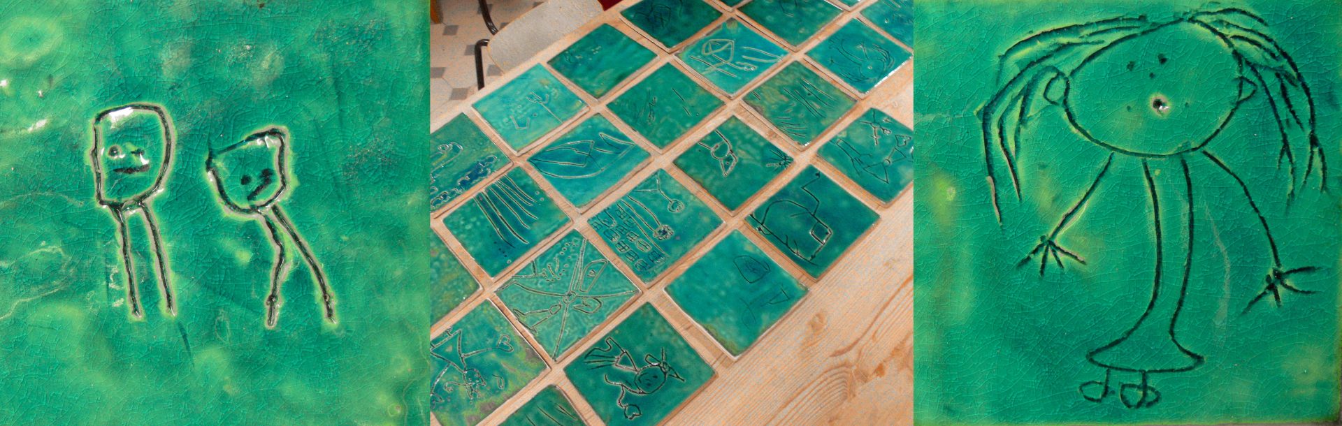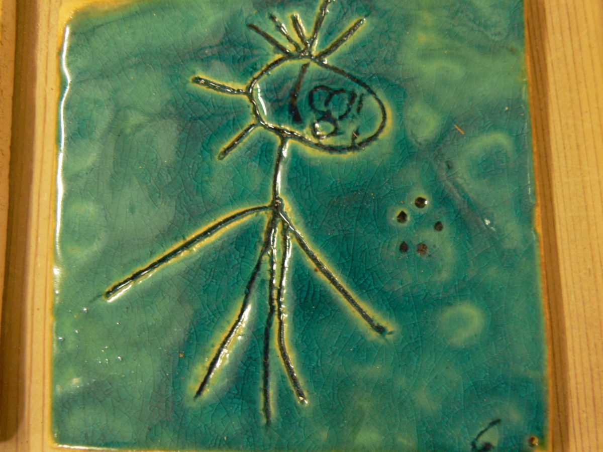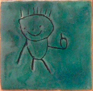 Ist das alles bedacht, liegt vor dem Kind eine gut vorbereitete, noch feuchte Tonfliese. Jedes Kind bekommt einen Schaschlik-Spieß als Stift in die Hand – so wird es funktionieren, garantiert. Die einen beginnen vorsichtig Striche zu machen, die anderen gehen kraftvoll ran und ziehen tiefe Furchen.