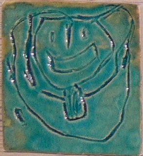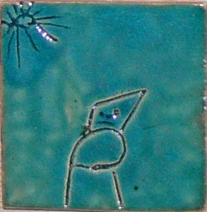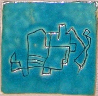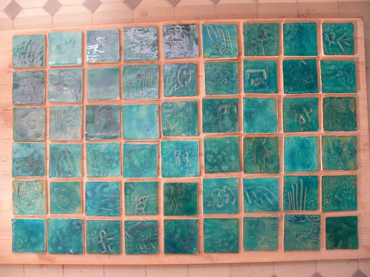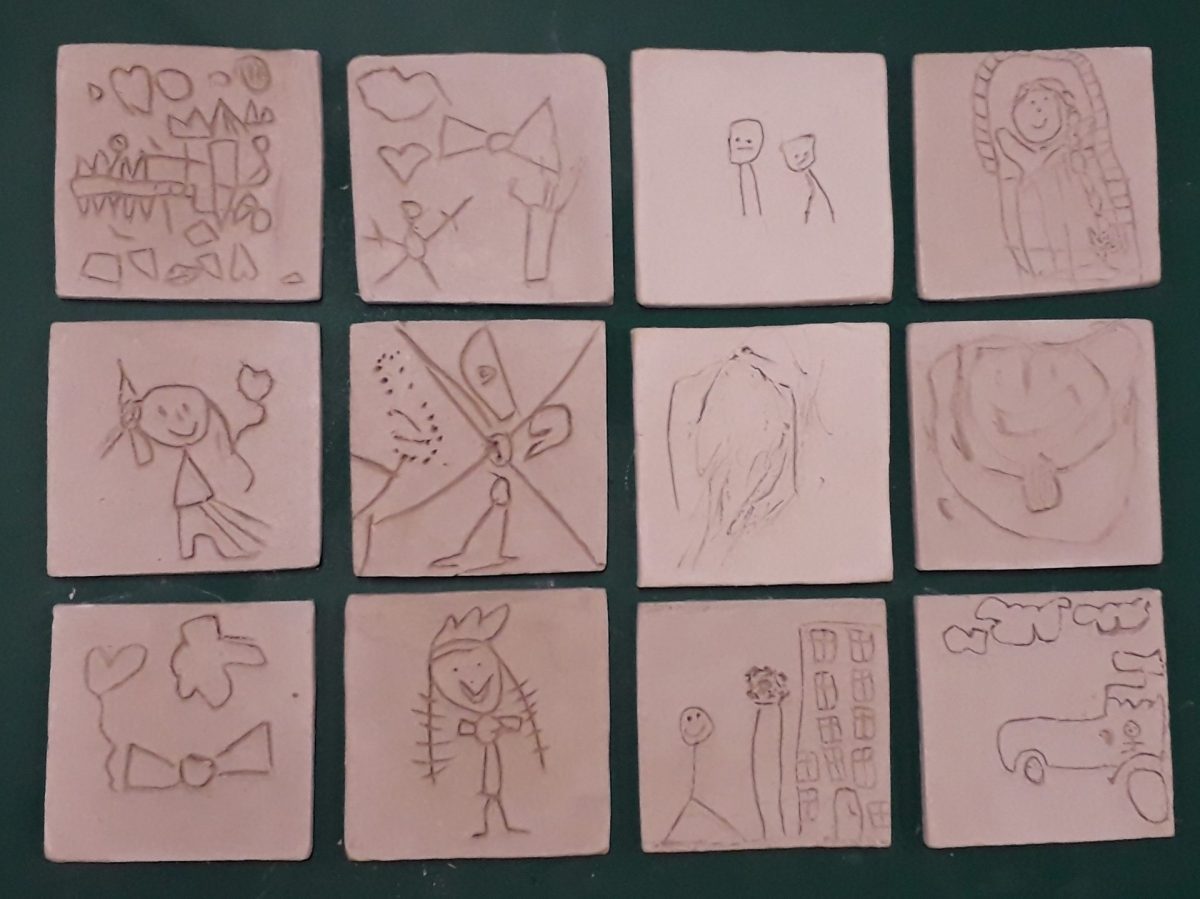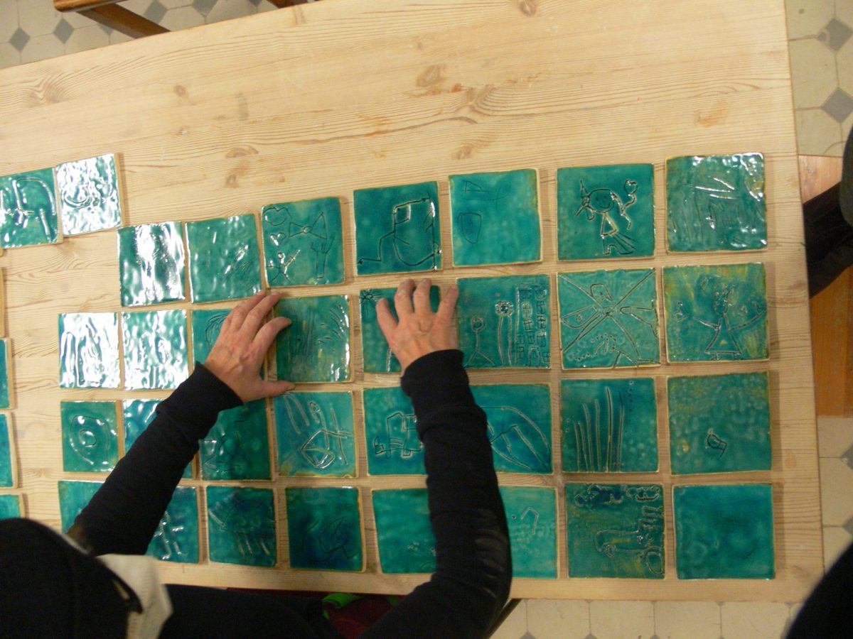 Ist das alles bedacht, liegt vor dem Kind eine gut vorbereitete, noch feuchte Tonfliese. Jedes Kind bekommt einen Schaschlik-Spieß als Stift in die Hand – so wird es funktionieren, garantiert. Die einen beginnen vorsichtig Striche zu machen, die anderen gehen kraftvoll ran und ziehen tiefe Furchen.