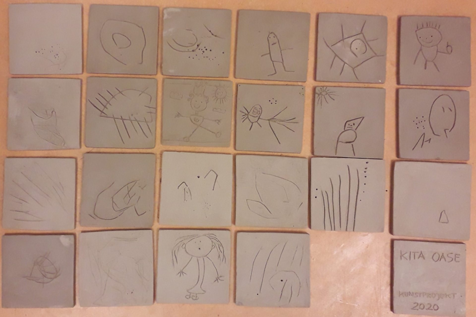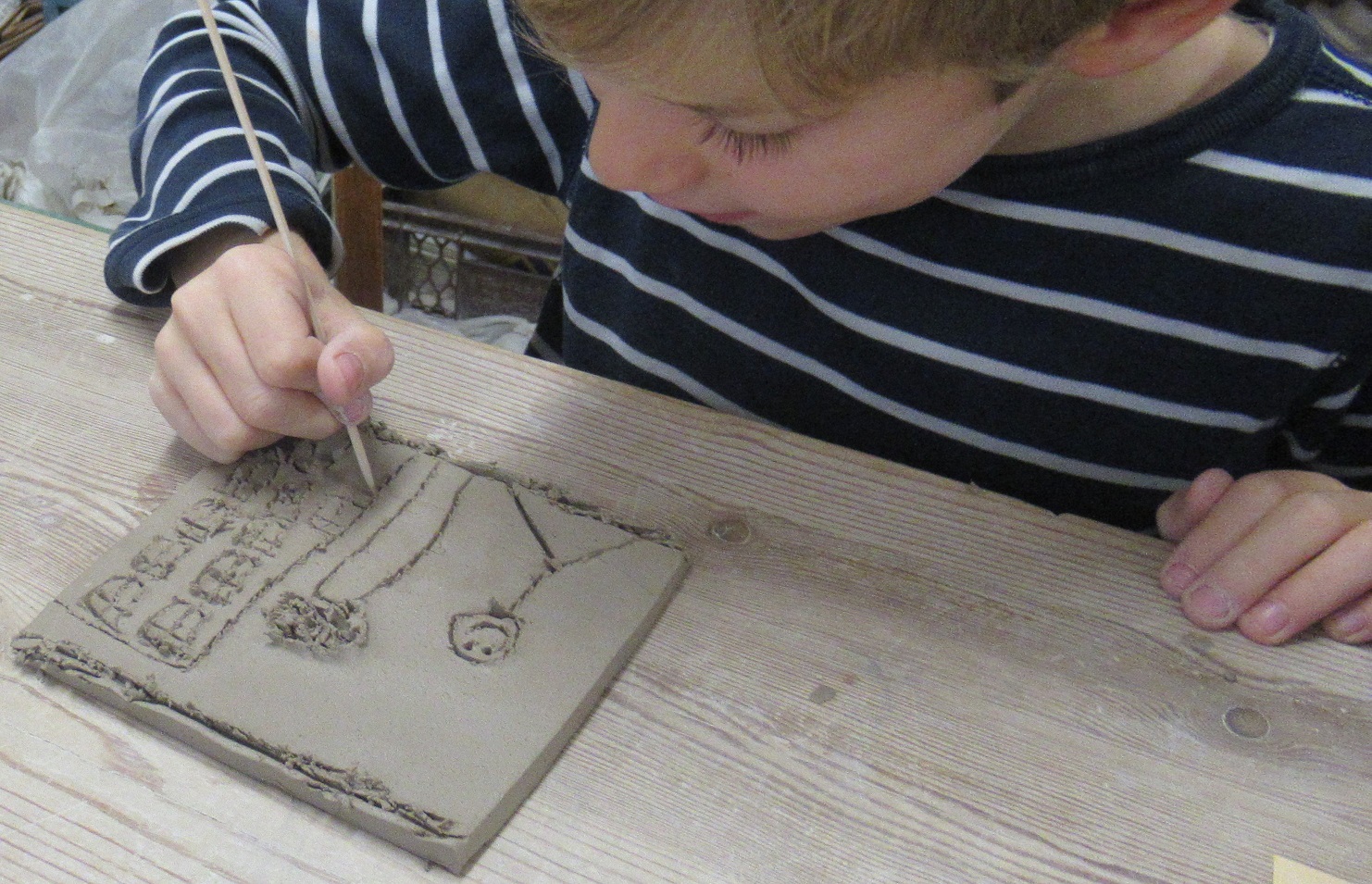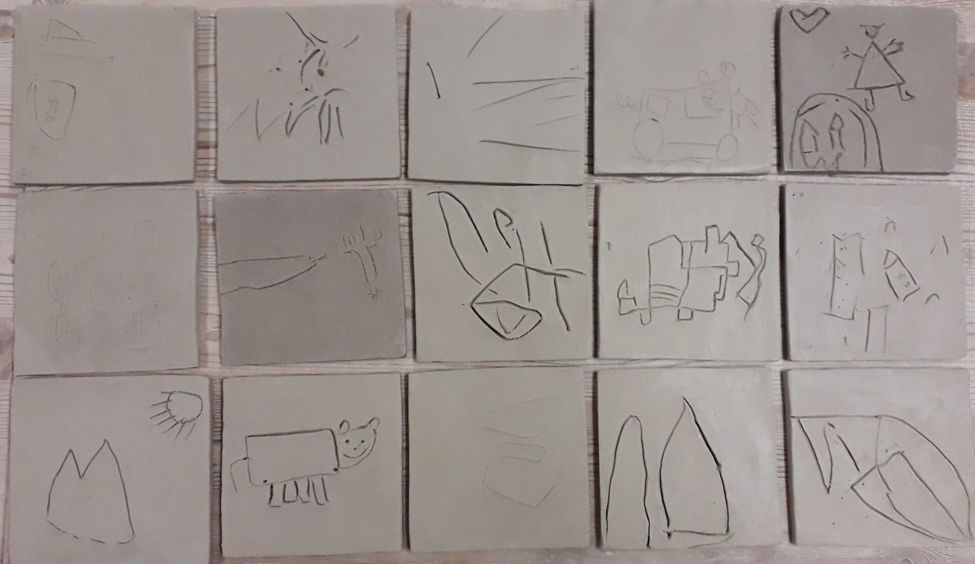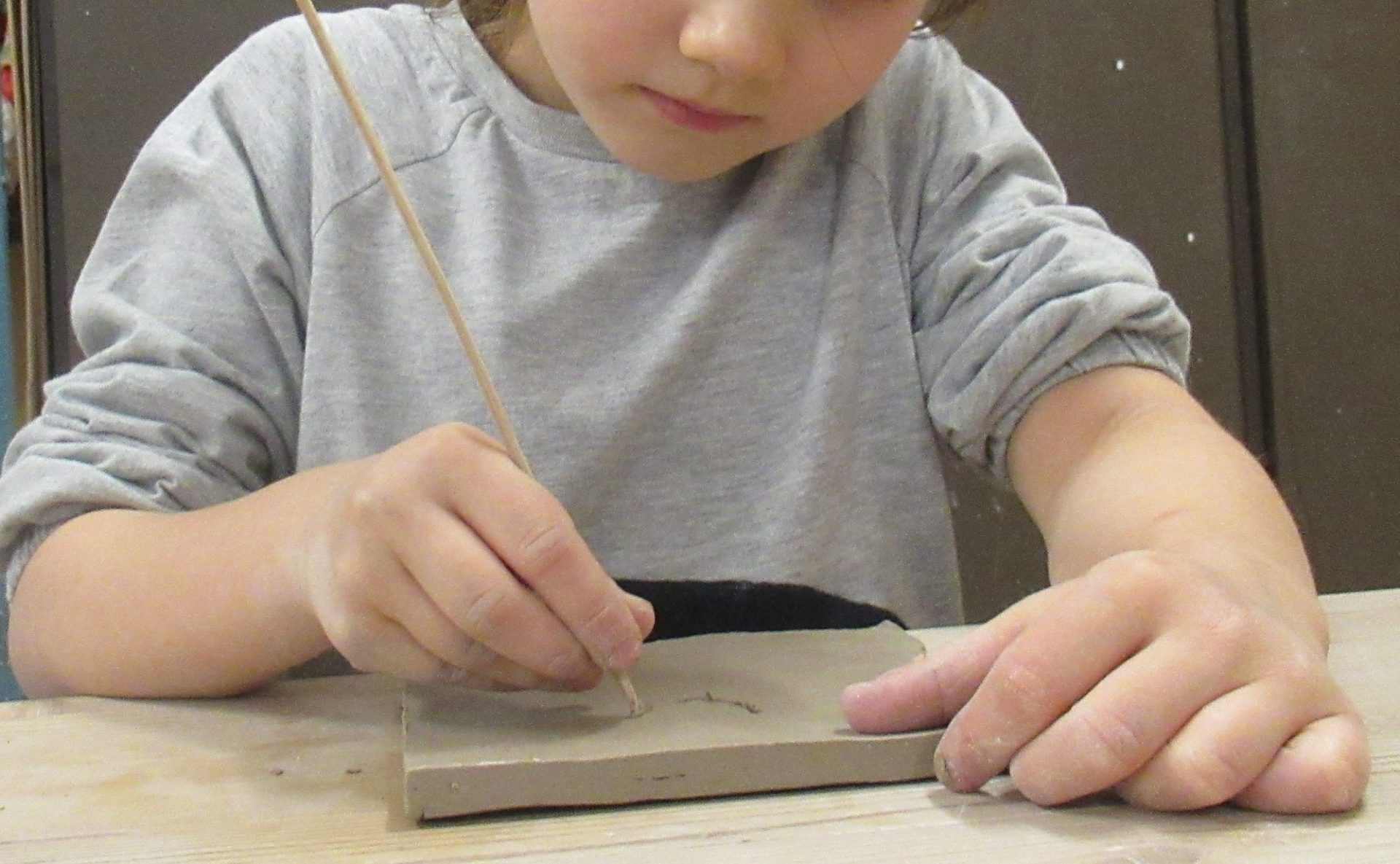 Ist das alles bedacht, liegt vor dem Kind eine gut vorbereitete, noch feuchte Tonfliese. Jedes Kind bekommt einen Schaschlik-Spieß als Stift in die Hand – so wird es funktionieren, garantiert. Die einen beginnen vorsichtig Striche zu machen, die anderen gehen kraftvoll ran und ziehen tiefe Furchen.