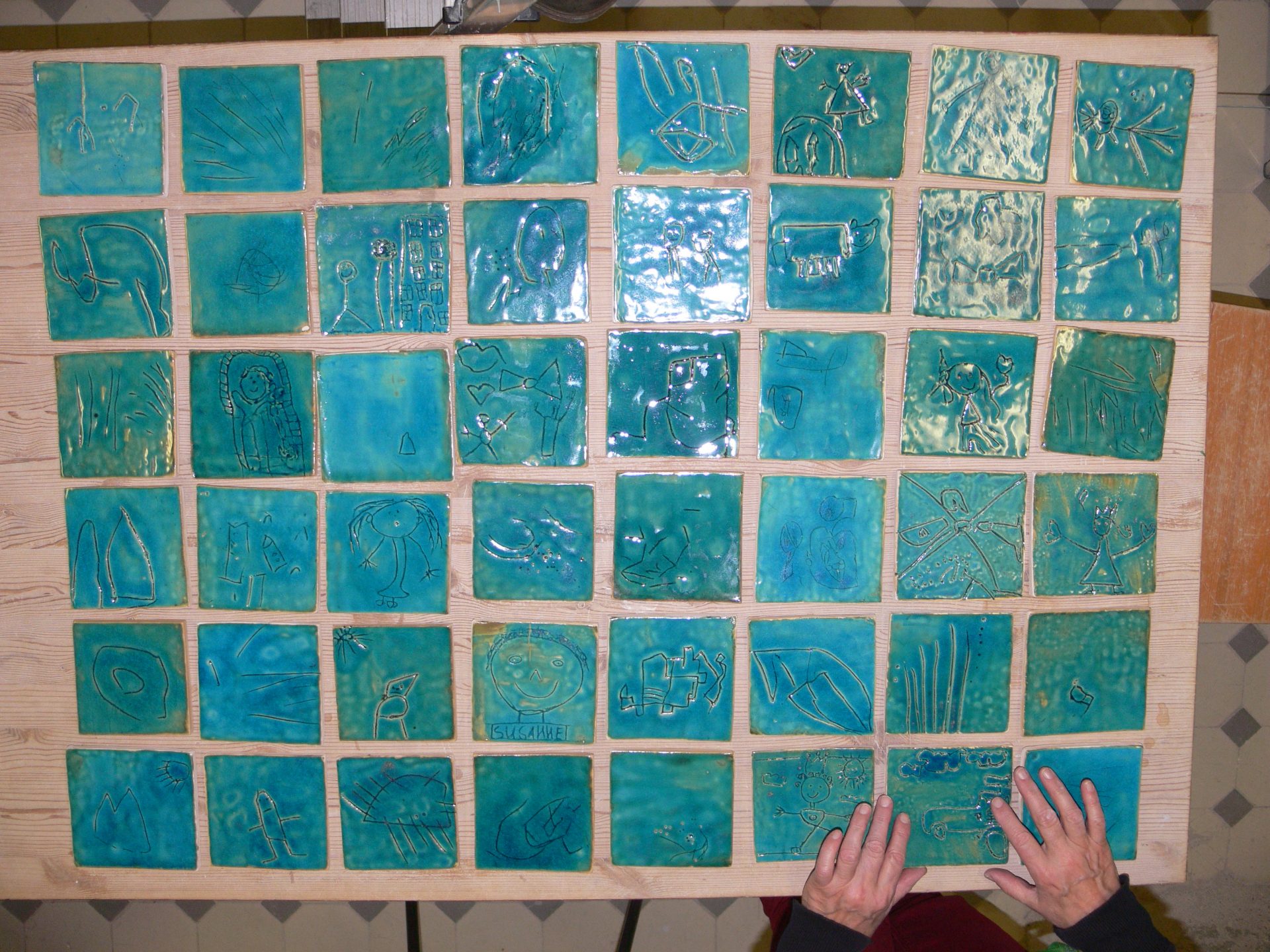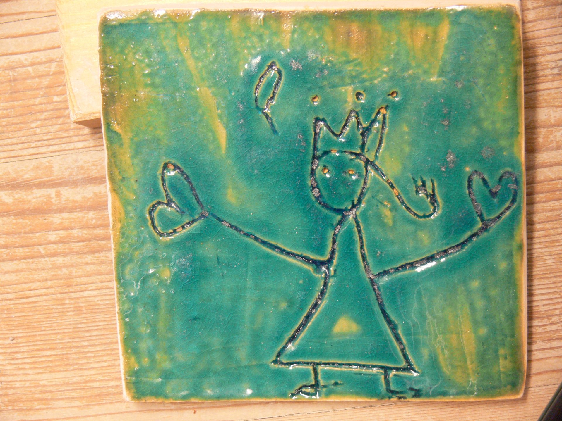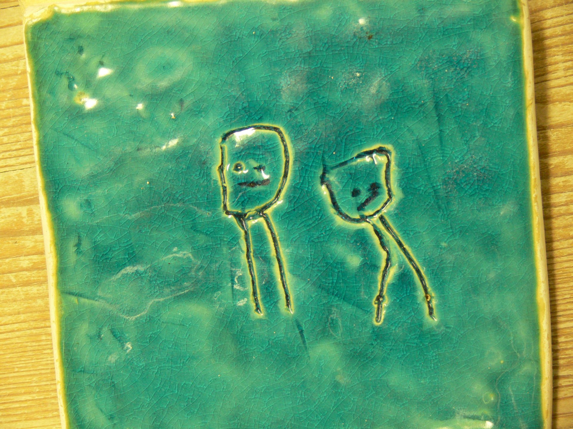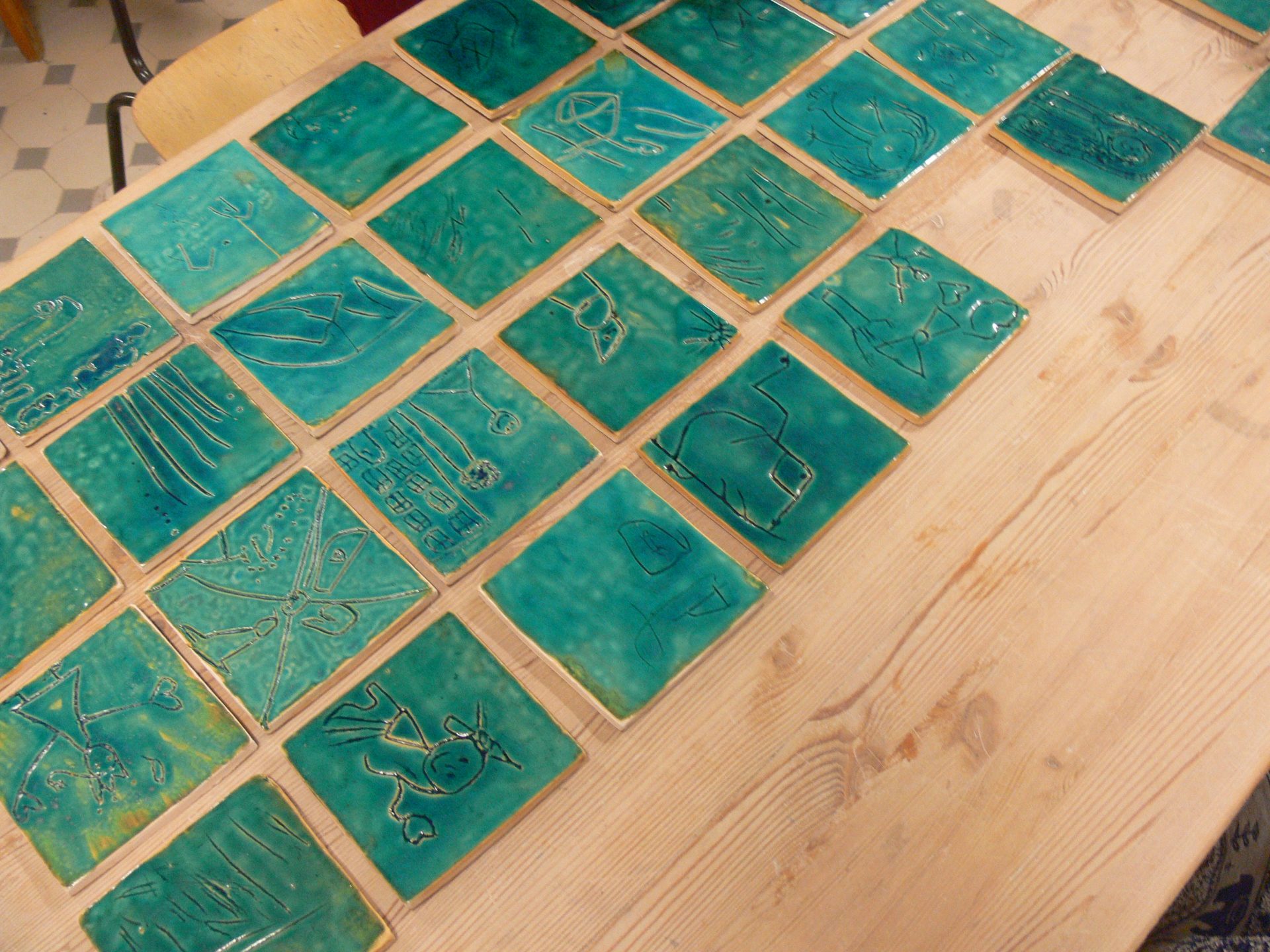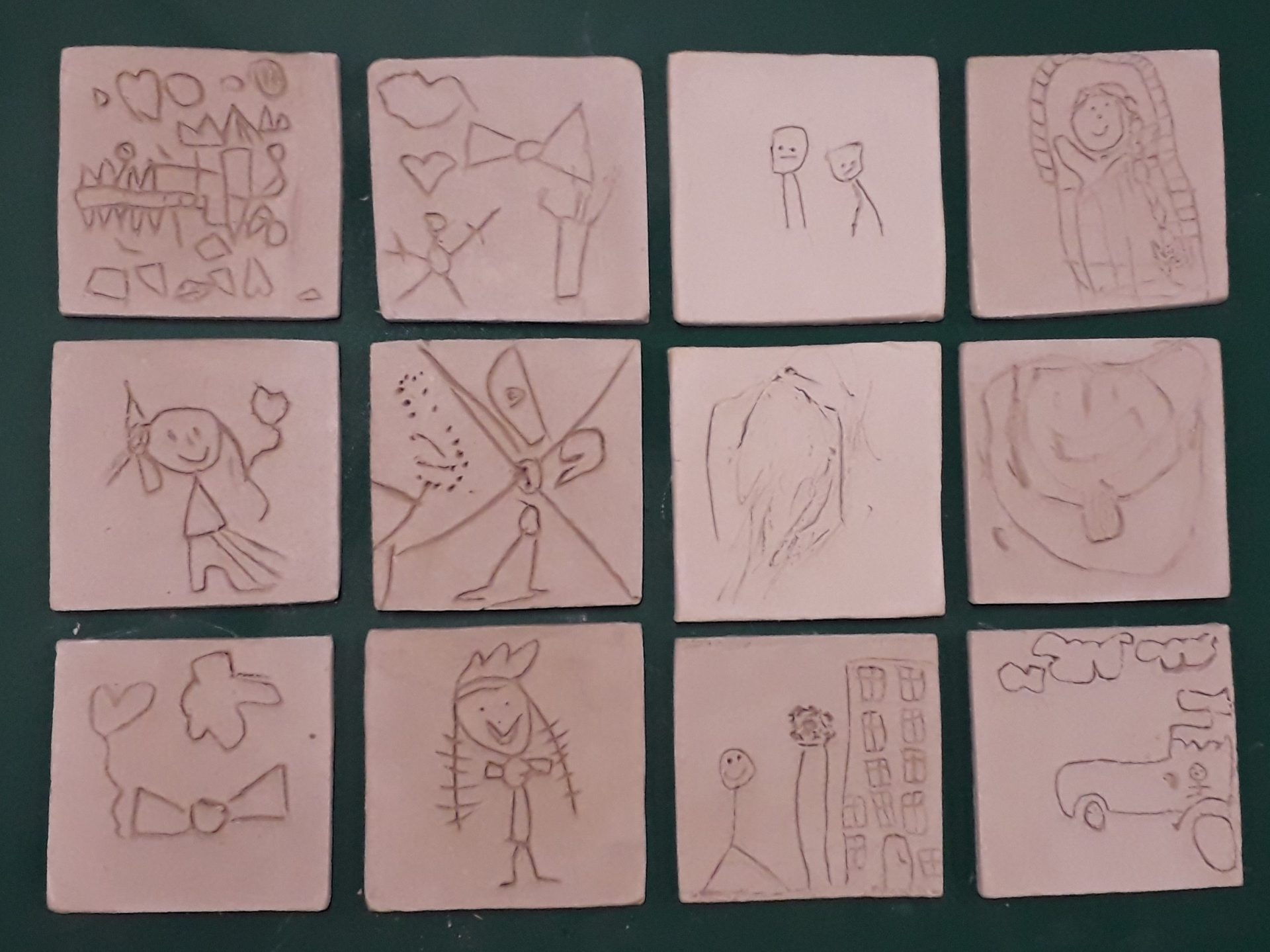 Ist das alles bedacht, liegt vor dem Kind eine gut vorbereitete, noch feuchte Tonfliese. Jedes Kind bekommt einen Schaschlik-Spieß als Stift in die Hand – so wird es funktionieren, garantiert. Die einen beginnen vorsichtig Striche zu machen, die anderen gehen kraftvoll ran und ziehen tiefe Furchen.