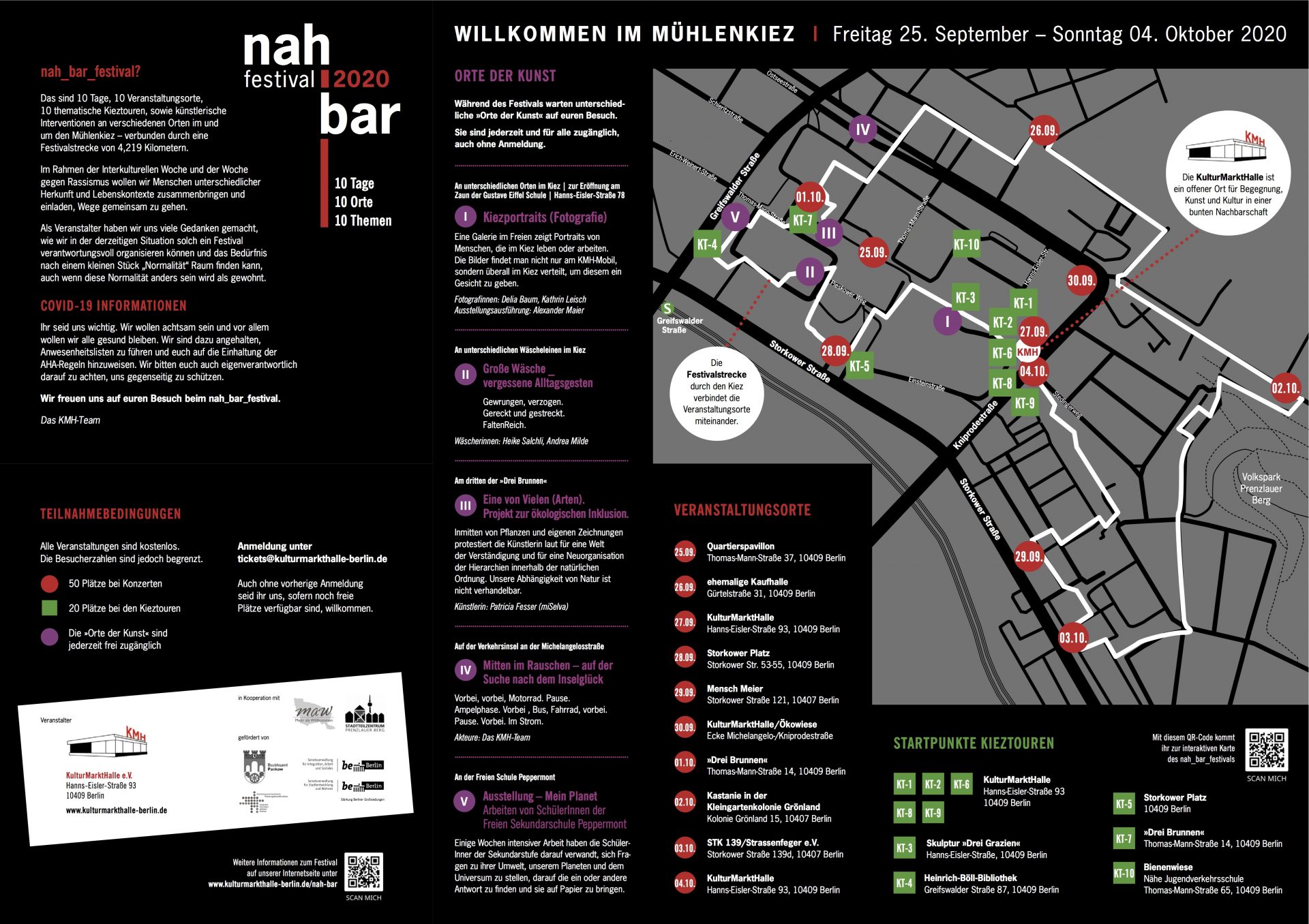 Im Rahmen der Interkulturellen Woche und der Internationalen Wochen gegen Rassismus veranstaltete unser Kooperationspartner, die KulturMarktHalle, zehn Tage lang das nah_bar Festival. Das bedeutet: von Freitag, 25.9. bis Sonntag, 4.10.2020 – 10 Tage, 10 Performances an 10 Orten im Mühlenkiez, verbunden durch eine Festivalstrecke, deren Länge dem Zehntel einer Marathonstrecke entspricht: 4,219 Kilometer. Organisatorisch unterstützt unser Projekt Mehr als Willkommen!