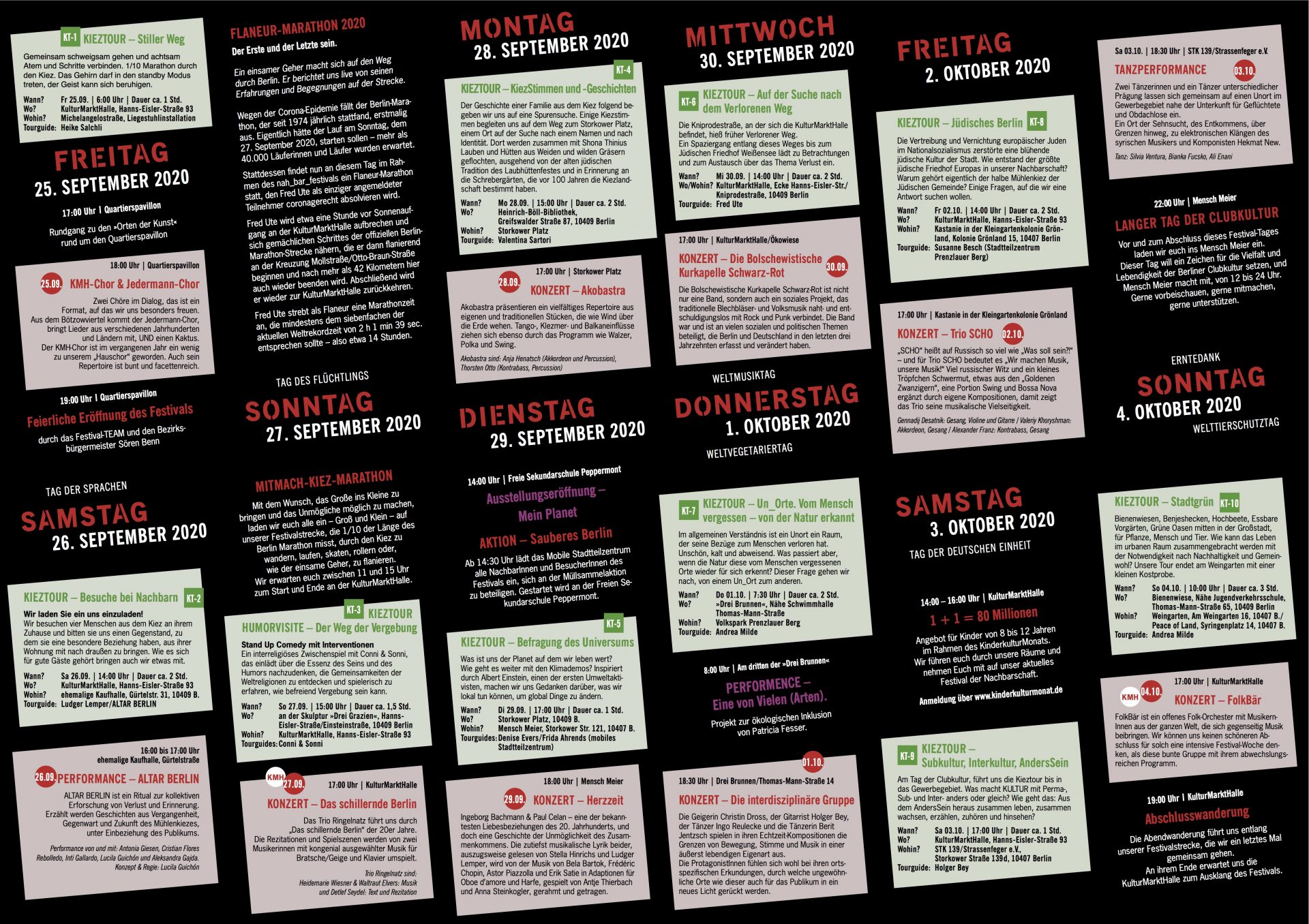 Am 27.9. wird sich ein einsamer Geher früh morgens – der Strecke des abgesagten Berlin-Marathons folgend – auf den Weg durch Berlin machen und uns von seinen Begegnungen live berichten. Parallel sind wir alle während des Festivals eingeladen auf der Zehntel Strecke im Kiez – unserer Festivalstrecke – unseren individuellen Marathon zu begehen. So kommt das Große ins Kleine, das Schnelle wird nachvollziehbar, das Volle wird überschaubar und das Unmögliche wird machbar. Wir werden reichlich beschenkt – nicht nur mit ungewöhnlichen Aus- und Einblicken in unseren wandelbaren Kiez.