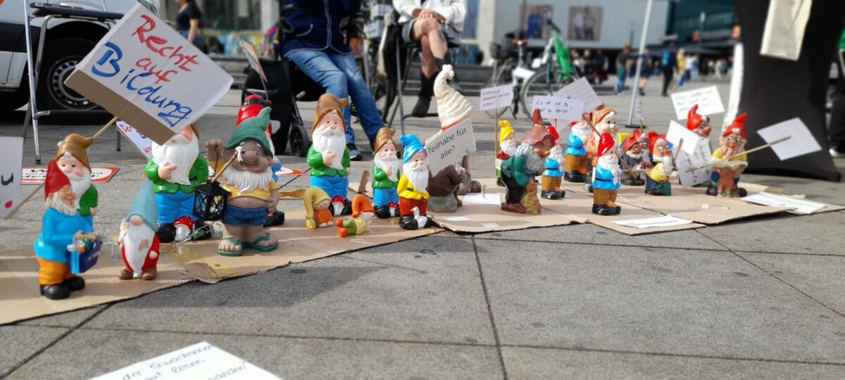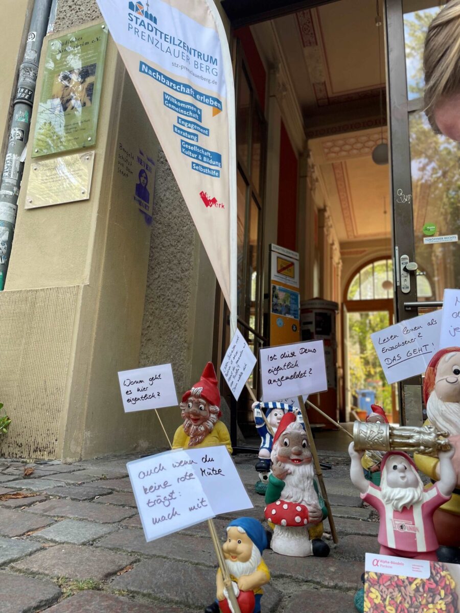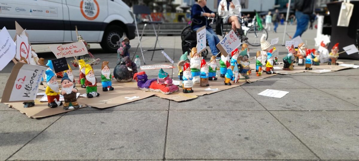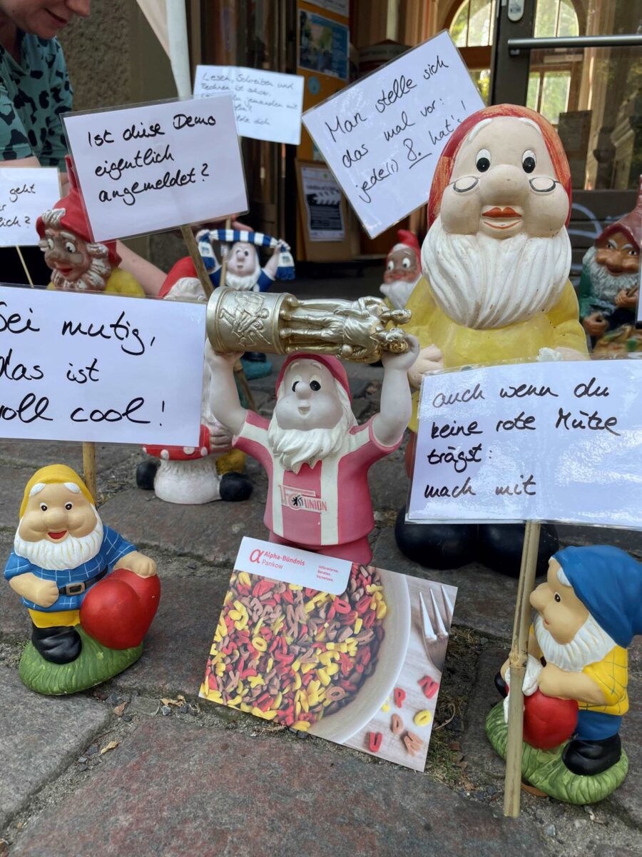 Natürlich kann man sich einer Aktion im öffentlichen Raum anschließen oder selbst eine veranstalten: Alles was man braucht, sind ein oder mehrere Gartenzwerge, die Schilder mit entsprechenden Botschaften halten. Informationen zu den geplanten Aktionen in den Berliner Bezirken gibt es beim jeweiligen Alpha-Bündnis.