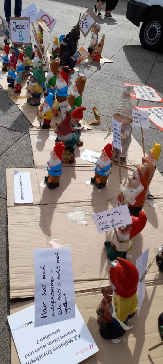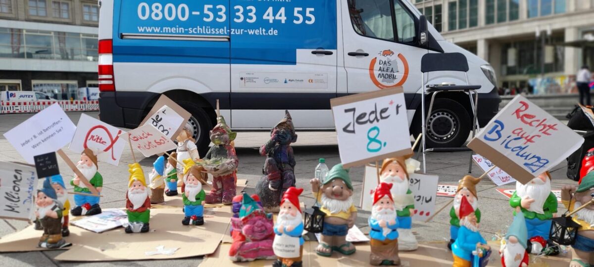 Berlin, aufgepasst! Im September werden überall in Berlin Gartenzwerge zu finden sein, die einen Aufstand proben. Sie haben eine Botschaft: Endlich mehr Aufmerksamkeit für das Thema Alphabetisierung und Grundbildung! Ihre Botschaft tun sie auf Demonstrationsschildern kund.